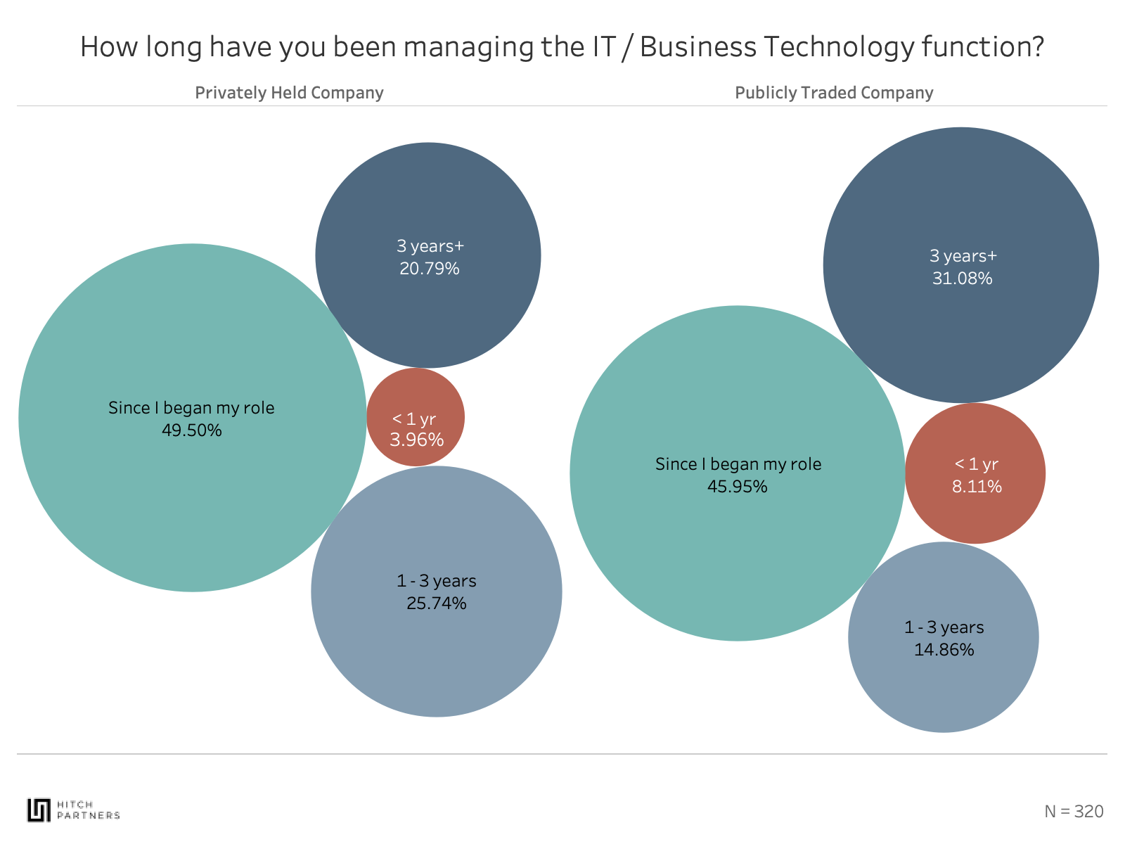 Nearly the majority of CISOs within both publicly traded and privately held companies, have managed the IT function since they began in their role. This indicates a likelihood that they were recruited in part due to their corporate security / IT acumen.